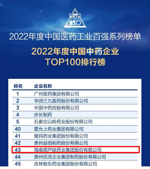 会议期间,一年一度的中国医药工业百强系列榜单隆重揭晓,BG大游药业集团凭借领先的研发优势和扎实的生产实力以及稳健的市场推广能力,连续第四年成功入选“2022年度中国中药企业TOP100排行榜” ,排名稳步上升至第43位。